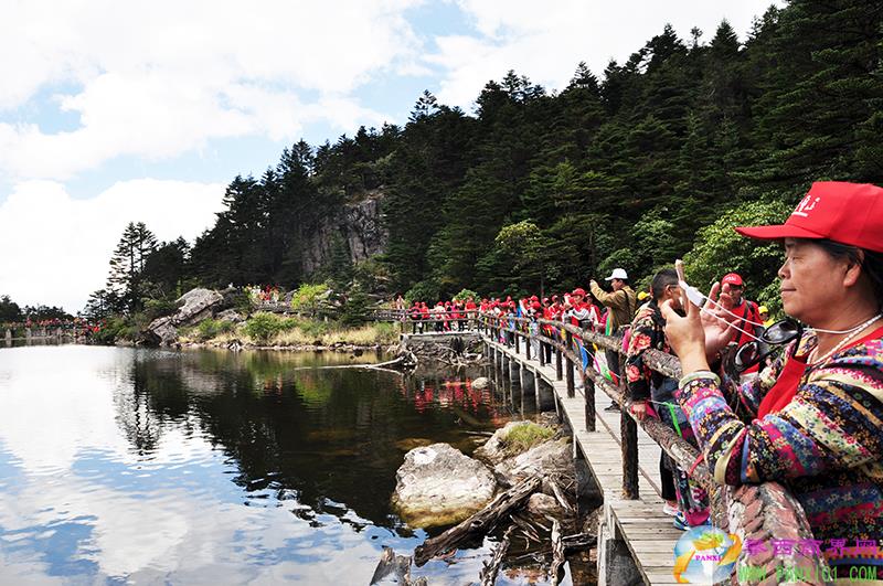 接下來我向大家介紹景區(qū)最美的一個湖泊—仙草湖,從黑龍?zhí)哆?,沿阿魯崖拾階而上,便是仙草湖了,仙草湖海拔3850米,雖不及黑龍?zhí)赌敲磳掗?,卻格外的飄逸脫俗。遠(yuǎn)處群山環(huán)繞,湖畔叢林花草密布,湖中水草綽約。山風(fēng)襲來,湖水蕩漾,水草舞動,閃亮的湖水和環(huán)狀的水草組成了一個“太極”圖案。湖碧草逾綠,山青花欲然。每年4到5月當(dāng)仙草湖畔的索瑪花開,美麗的索瑪花與湖輝映,更添嬌柔與美艷,仿佛這樹與花、水與草都展示著一種與世無爭的美麗。仙草湖是螺髻山景區(qū)不得不讓人去看看的地方,她的美,她的超凡脫俗是那么的圣潔動人。仙草湖也是四川省100個最美觀景拍攝地之一。