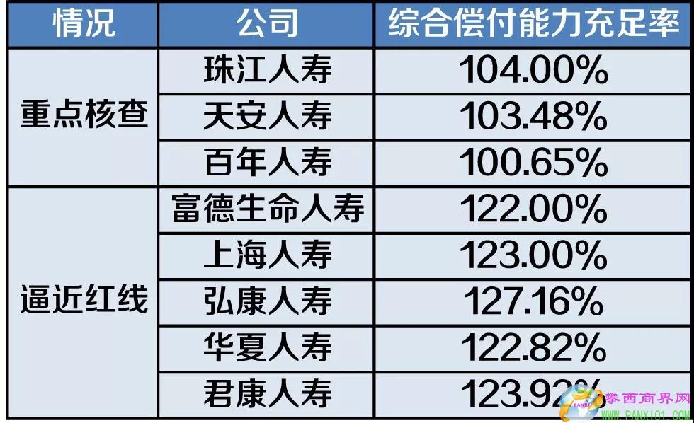 除不達(dá)標(biāo)險(xiǎn)企外,2018年第四季度有3家險(xiǎn)企被列為重點(diǎn)核查對(duì)象,分別是珠江人壽、天安人壽和百年人壽,其綜合償付能力充足率分別為104%、103.48%和100.65%。此外,有5家人身險(xiǎn)公司的綜合償付能力充足率逼近重點(diǎn)核查紅線(xiàn),分別為富德生命人壽、上海人壽、弘康人壽、華夏人壽和君康人壽,其綜合償付能力充足率分別為122%、123%、127.16%、122.82%和123.92%。